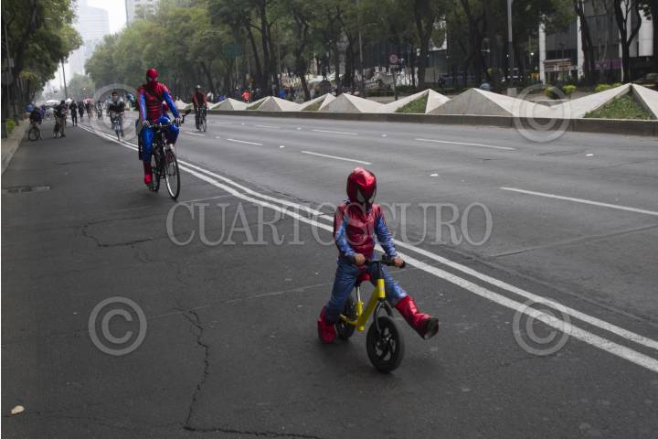 CIUDAD DE MÉXICO, 08ENERO2017.- Padre e hijo disfrazados del hombre araña, personaje de las tiras cómicas, durante el paseo ciclista en avenida Reforma. FOTO: MOISÉS PABLO /CUARTOSCURO.COM