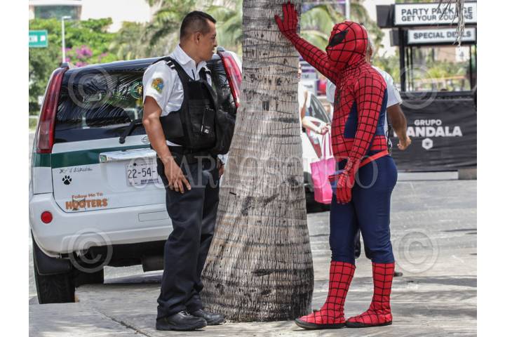 CANCÚN, QUINTANA ROO, 15MARZO2018.- Un policía y un hombre disfrazado del hombre araña en la zona hotelera de Cancún. FOTO: ELIZABETH RUIZ /CUARTOSCURO.COM