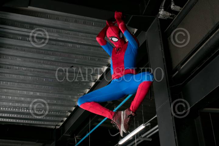 Un fan disfrazado del Hombre Araña posa para una fotografìa sobre un poste vehicular