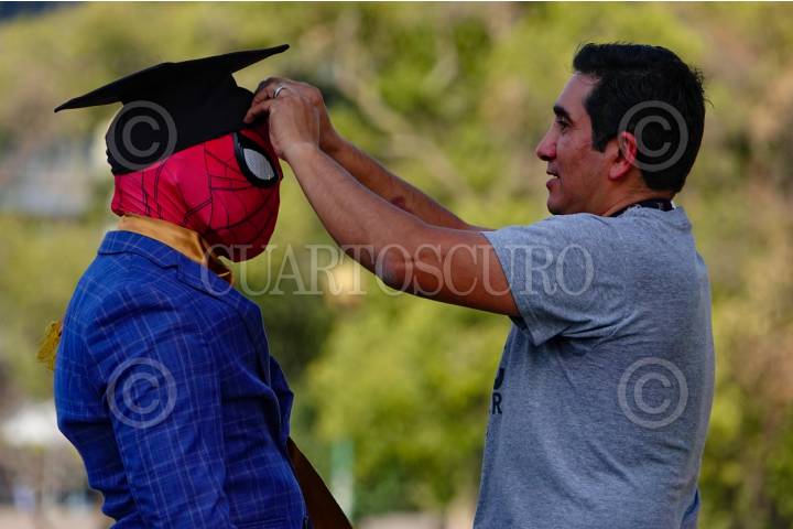 CIUDAD DE MÉXICO, 22MARZO2024.- Un estudiante se colocó una máscara del hombre araña para tomarse la foto de graduación en Ciudad Universitaria. FOTOS: ROGELIO MORALES /CUARTOSCURO.COM