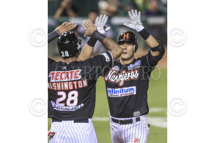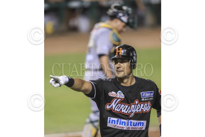 HERMOSILLO, SONORA, 30OCUBRE2016.- Luis Alfonso Garcia celebra su Home Run 140, con el que supera a Ronnie Camacho (139) uno de los mejores peloteros mexicanos de todos los tiempos, durante el 3er. encuentro de la serie de beisbol entre Naranjeros de Hermosillo vs Cañeros de los Mochis, Temporada 2016 2017 de la Liga Mexicana del Pacifico. FOTO: LUIS GUTIÉRREZ / NORTEPHOTO.COM /CUARTOSCURO.COM