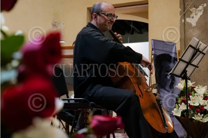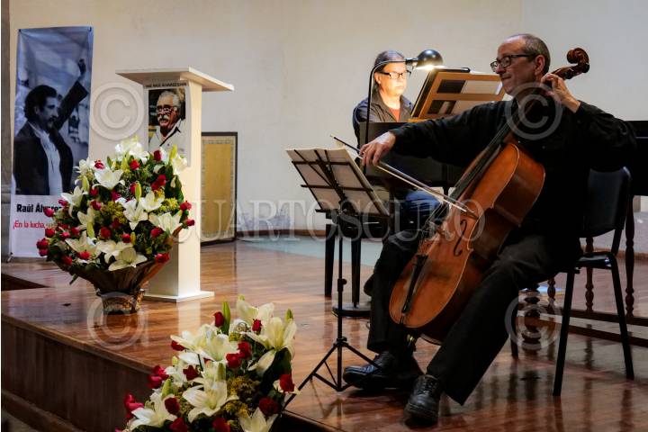 CIUDAD DE MÉXICO, 09AGOSTO2024.- Tres músicos tocaron en vivo durante el homenaje póstumo a Raúl Álvarez Garín, activista y político mexicano. Este evento, organizado por el Comité 68 para celebrar el 10º aniversario de su fallecimiento, se llevó a cabo en el Ex Templo de Corpus Christi. FOTO: ALICE MORITZ /CUARTOSCURO.COM