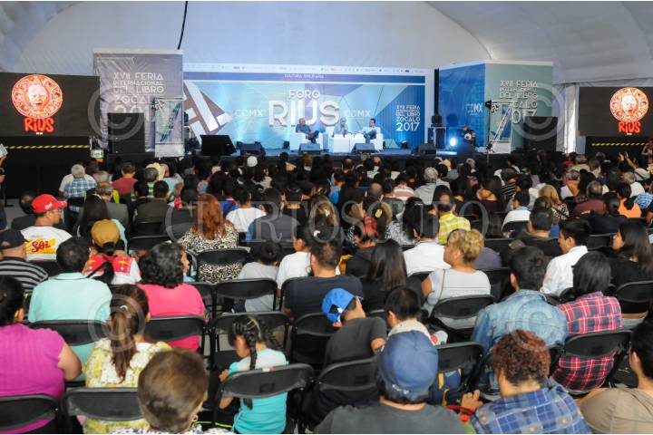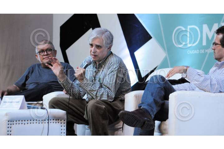 CIUDAD DE MÉXICO, 21OCTUBRE2017.- Los caricaturistas Rafael Ángel Pineda "Rape", Antonio Helguera y Rafael Barajas "el fisgón", ofrecieron una plática y homenaje a Eduardo del Río "Rius", en el marco de la XVII Feria Internacional del Libro en la plancha del zócalo capitalino. FOTO: DIEGO SIMÓN SÁNCHEZ /CUARTOSCURO.COM