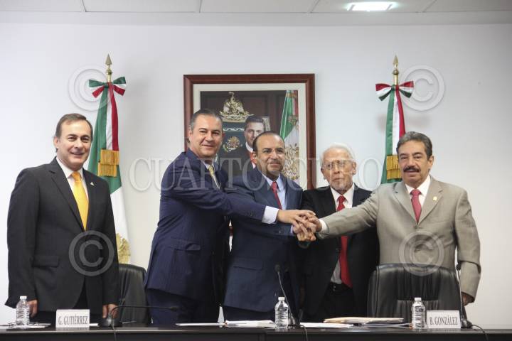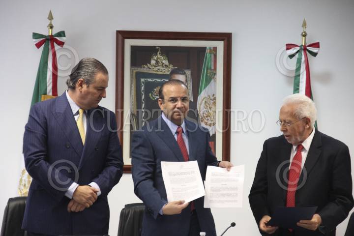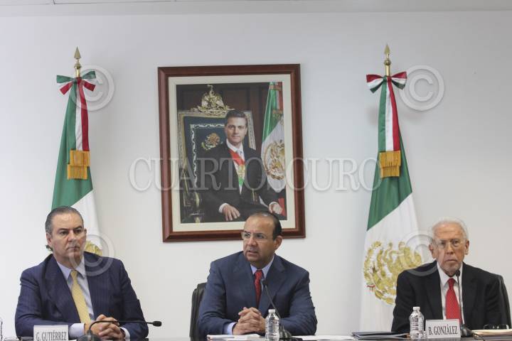 MÉXICO, D.F., 28SEPTIEMBRE2015.- Gerardo Gutiérrez Candiani, presidente del Consejo Coordinador Empresarial; Alfonso Navarrete Prida, secretario del Trabajo y Previsión Social, y Basilio González, presidente de la CONASAMI, durante el anunció de la homologación del salario mínimo en todo el país a 70.10 pesos al día. FOTO: ARMANDO MONROY /CUARTOSCURO.COM