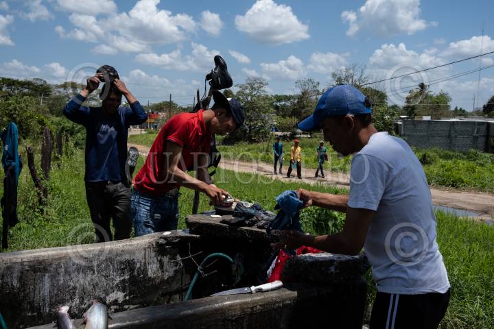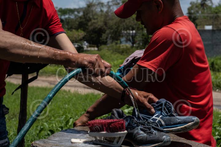 Migrantes hondureños lavan sus prendas de ropa en las inmediaciones de la Casa del Migrantes La 72.