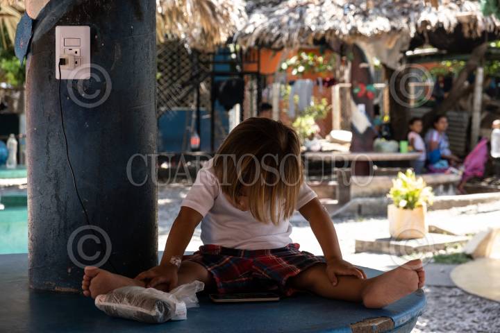 Un niño migrante observa una pelicula en el celular de su madre mientras la comida es servida en la Casa del Migrante.