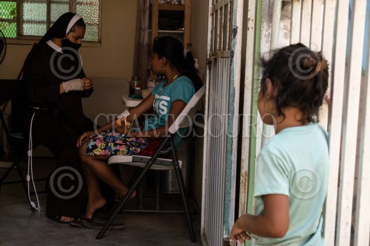 Una joven migrante hondureña es atendida por la enfermera de la casa del migrante despues de ser mordida por un perro.