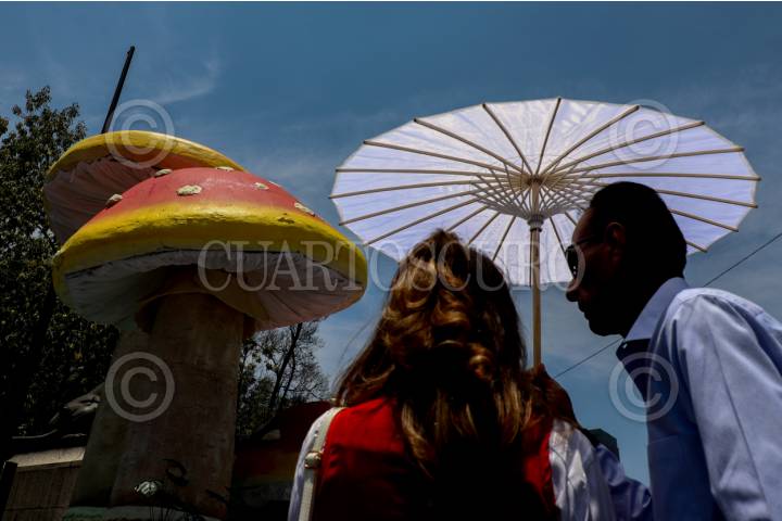 CIUDAD DE MÉXICO, 17ABRIL2025.- En la Puerta de los Leones, en la entrada del Bosque de Chapultepec, se encuentran colocados estructuras de hongos que forman parte del Festival SPORA. FOTO: DANIEL AUGUSTO/ CUARTOSCURO.COM
