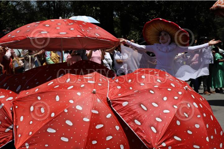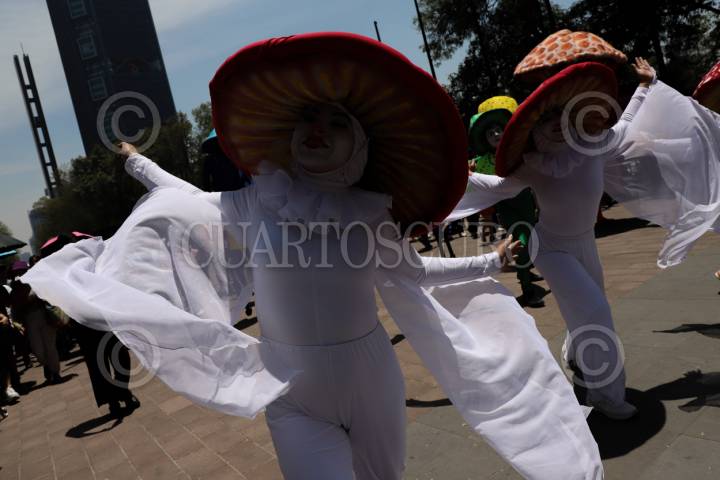 CIUDAD DE MÉXICO, 17ABRIL2025.- Bailarines caracterizados como hongos realizaron un recorrido desde la Puerta de los Leones hasta el Altar a la Patria. FOTO: DANIEL AUGUSTO/ CUARTOSCURO.COM