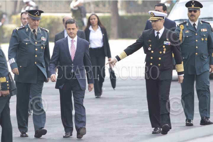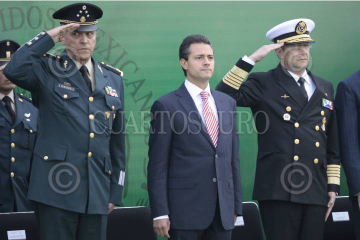 MÉXICO D.F., 30JULIO2013.- Enrique Peña Nieto, presidente de México; Vidal Francisco Soberón Sanz, Secretario de Marina; y Salvador Cienfuegos Zepeda, Secretario de la Defensa Nacional; durante la ceremonia de entrega de menciones honoríficas a las unidades y personal del Ejército, Armada y Fuerza Aérea mexicanos en la Plaza de la Lealtad de la Secretaría de la Defensa Nacional. FOTO: IVÁN STEPHENS /CUARTOSCURO.COM
