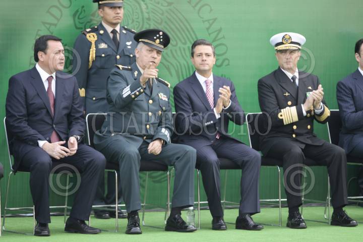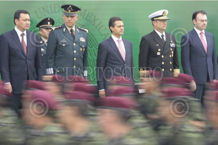 MÉXICO D.F., 30JULIO2013.- Miguel Ángel Osorio Chong, Secretario de Gobernación; Salvador Cienfuegos Zepeda, Secretario de la Defensa Nacional; Enrique Peña Nieto, presidente de México; y Vidal Francisco Soberón Sanz, Secretario de Marina; durante la ceremonia de entrega de menciones honoríficas a las unidades y personal del Ejército, Armada y Fuerza Aérea mexicanos en la Plaza de la Lealtad de la Secretaría de la Defensa Nacional. FOTO: IVÁN STEPHENS /CUARTOSCURO.COM