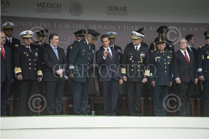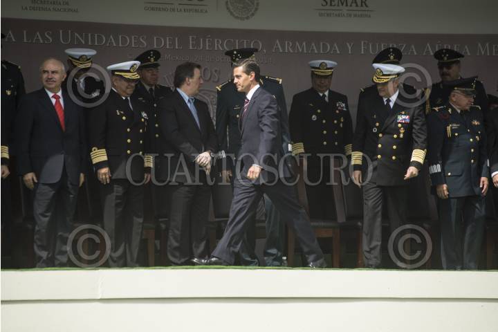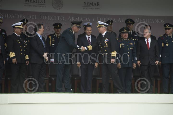 MÉXICO, D.F., 30JULIO2015.- Enrique Peña Nieto, presidente de México, encabezó la ceremonia de entrega de menciones honoríficas a las Unidades de la Armada, Ejército y Fuerza Aérea Mexicanos. En las instalaciones de la Secretaria de Marina se entregaron 25 menciones honoríficas a unidades de la SEDENA, SEMAR y la Fuerza Aérea. Presidieron el evento: Salvador Cienfuegos Zepeda, titular de SEDENA; Vidal Francisco Soberón Sanz, titular de SEMAR; Miguel Ángel Osorio Chong, titular de SEGOB, Arely Gomez, titular de PGR, Monte Alejandro Rubido, comisionado de seguridad nacional y Eugenio Imaz, titular de CISEN. FOTO: ISABEL MATEOS /CUARTOSCURO.COM