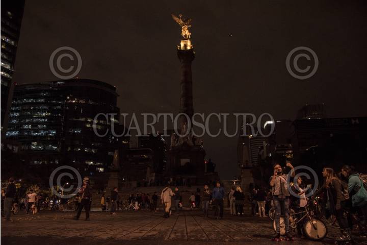 CIUDAD DE MÉXICO, 25MARZO2017.- Así lució el Ángel de la Independencia durante el evento La Hora del Planeta, donde Tania Muller, Secretaria del Medio Ambiente, y Jorge Rickards, presidente interino de la WWF México realizaron el apagado de monumentos en la capital. En este desafio ecológico participaron 7 mil países apagando alrededor de 10,400 monumentos en todo el mundo. FOTO: TERCERO DÍAZ /CUARTOSCURO.COM