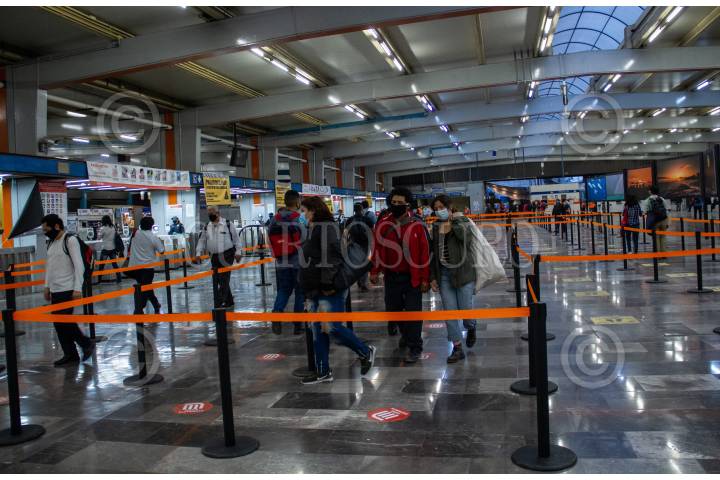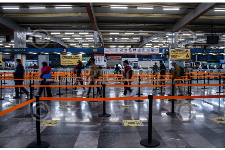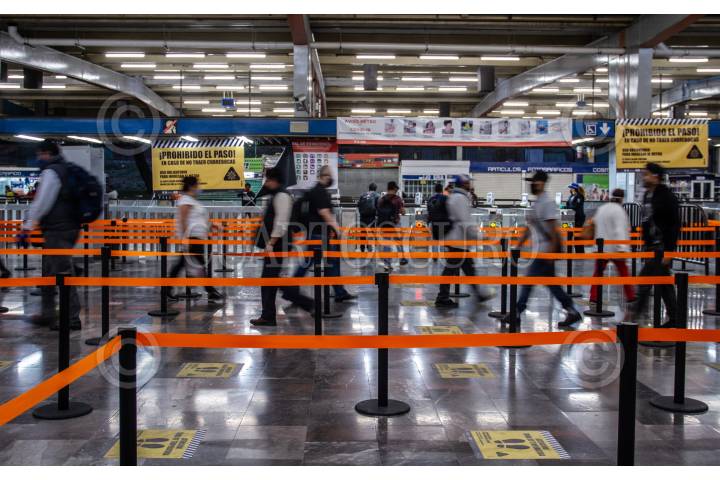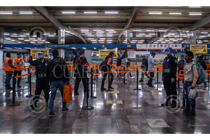 Aspecto de sistema de dosificación de usuarios para evitar aglomeraciones y así prevenir el contagio del virus COVID-19, en el Metro Cuatro Caminos de la linea dos