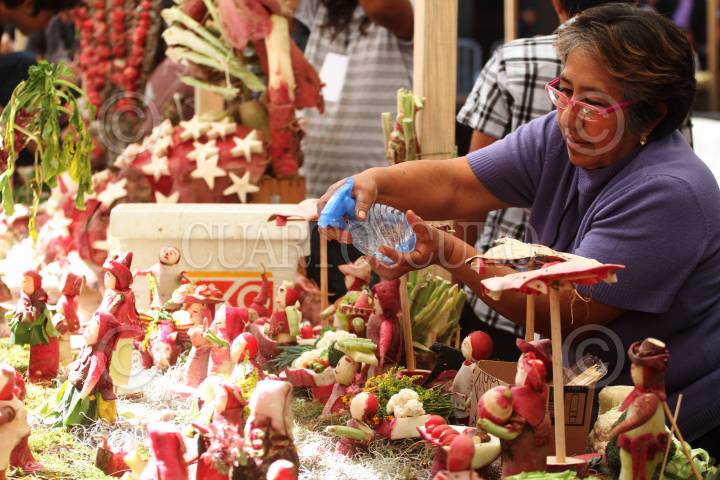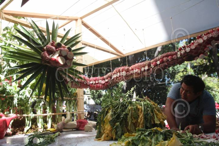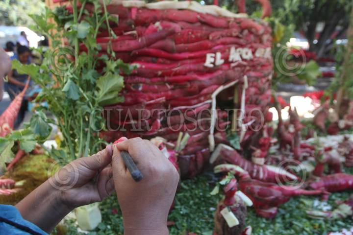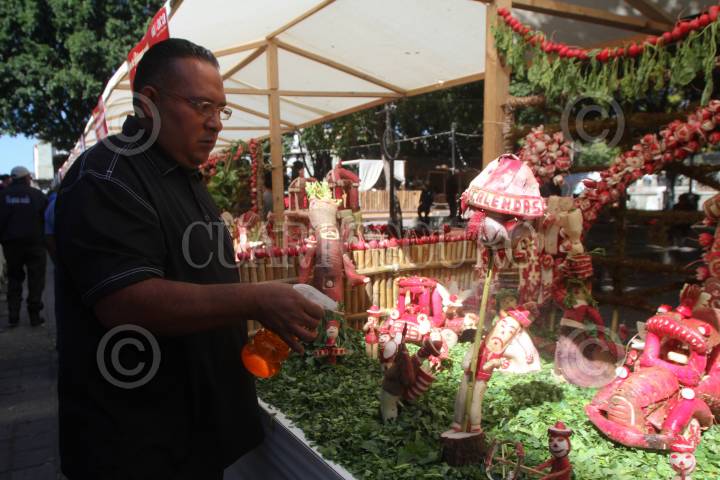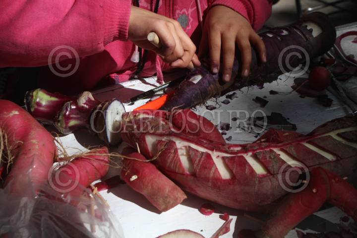 OAXACA, OAX, 23DICIEMBRE2016.- Este viernes se lleva a cabo la 119 edición de la Noche de Rábanos, tradición en la que hortelanos labran diversas figuras, basados en pasajes bíblicos, tradiciones locales o nacionales. Este concurso se divide en categoría libre y tradicional, en las que únicamente con cuchillos y palillos los participantes deben formar las figuras hechas con los rábanos del tipo champion y bartender. FOTO: ARTURO PÉREZ ALFONSO / CUARTOSCURO.COM