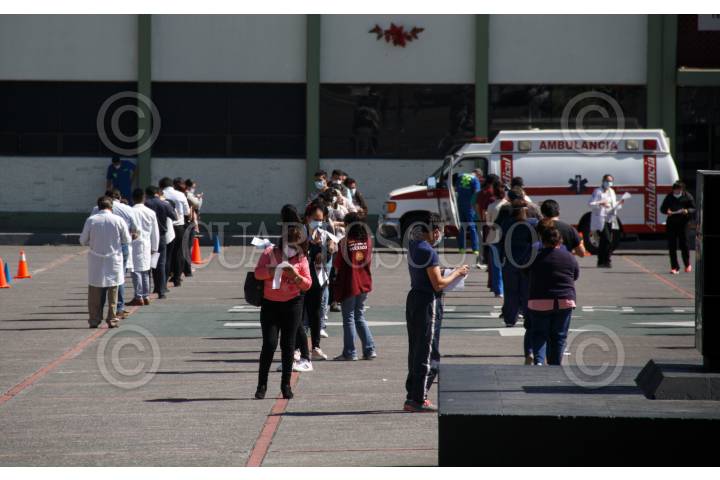 Personal Médico llegó en autobuses para hacer fila desde tempranas horas para aplicarse la vacuna contra covid-19