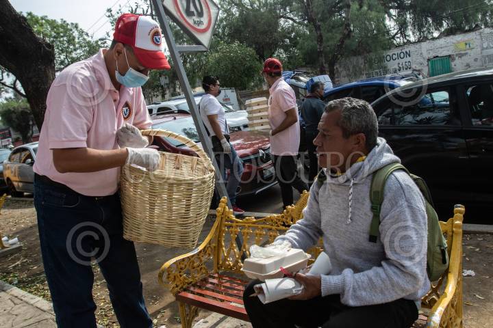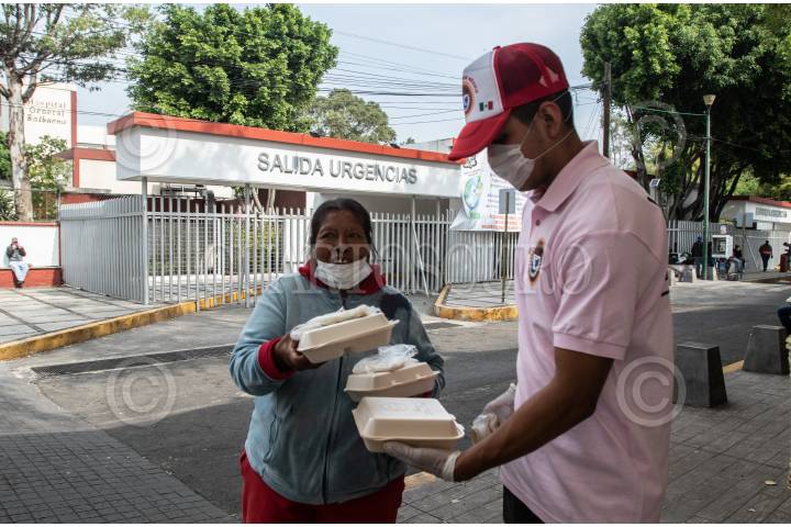 Miembros de la asociación vamos por México, entregan diariamente comida a los familiares que esperan noticias sobre los pacientes internados en el Hospital General Balbuena