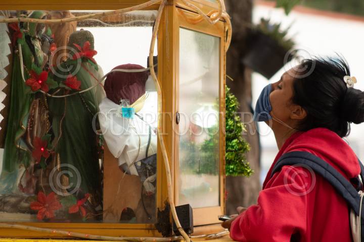 En las afueras del hospital Balbuena una mujer reza en un altar de la Virgen de Guadalupe.