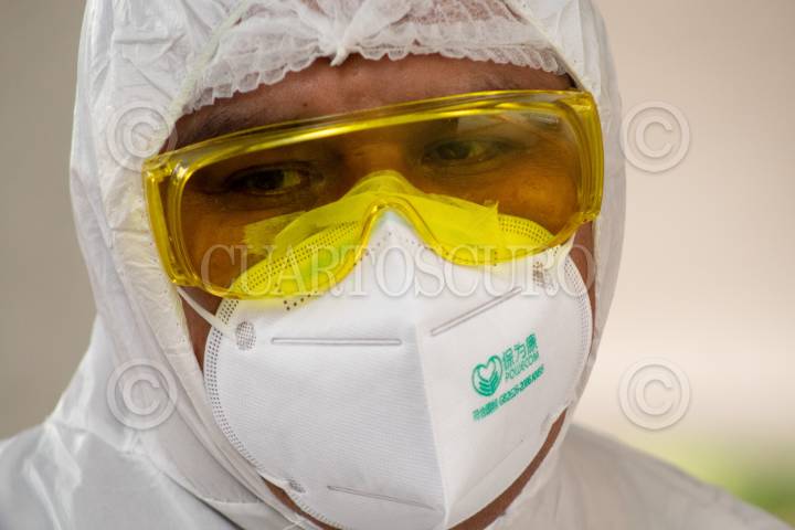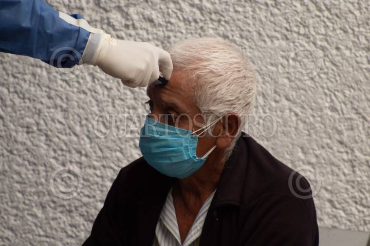Personal de salud del Hospital Balbuena, le toma la temperatura a un hombre presuntamente con síntomas de COVID-19.