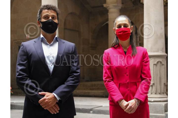 Claudia Sheinbaum y Cassiano de Stefano, momentos después de presentar alianza en conferencia de prensa.