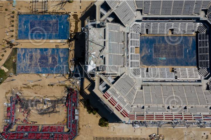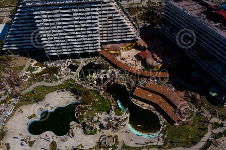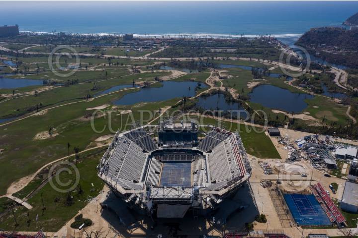 ACAPULCO, GUERRERO, 09NOVIEMBRE2023.- La Arena GNP de Acapulco, recinto en donde se celebra el Abierto Mexicano de Tenis, luce con múltiples daños tras el paso del huracán Otis en el puerto. Gradas colapsadlas y arena en las canchas de tenis son algunos de los daños visibles en el inmueble. A su vez, también sería sede de distintos conciertos por el Ola Fest 2023. FOTO: GALO CAÑAS/CUARTOSCURO.COM