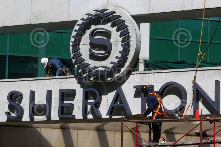 CIUDAD DE MÉXICO, 19NOVIEMBRE2023.- Trabajadores remodelan el logotipo de l hotel Sheraton en avenida Reforma. FOTO: MOISÉS PABLO/CUARTOSCURO.COM
