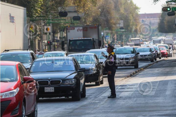 Un policía dirige el intenso tráfico en Eje Central. Desde el día de ayer esta vigente la Fase 1 de la Contingencia Ambiental por los altos índices de contaminantes.