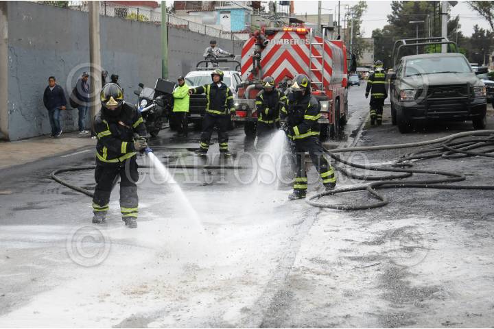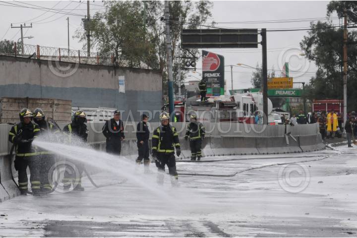 NEZAHUALCÓYOTL, EDOMEX, 01JULIO2024. - Bomberos capitalinos limpian la calle donde presuntamente hubo un derramamiento de combustible lo que terminó por originar el incendio. FOTO: DANIEL AUGUSTO /CUARTOSCURO.COM