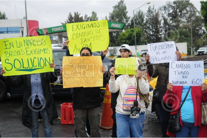 NEZAHUALCÓYOTL, EDOMEX, 01JULIO2024. - Vecinos de la colonia Cuchilla del Tesoro bloquearon la Av. 604 solicitando el cambio de ductos, esto luego de las denuncias del olor a combustoleo que salía de las coladeras y que podría haber ocasionado el incendio de esta mañana en la misma zona. FOTO: DANIEL AUGUSTO /CUARTOSCURO.COM