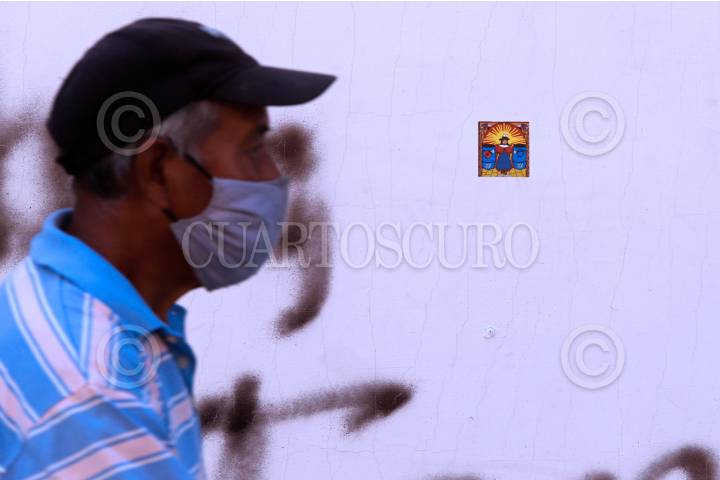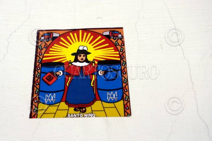 Una estampa con la imagen del Niño Huachicolero fue pegada en los muros del Templo de la Compañía.