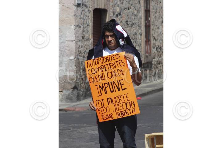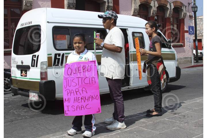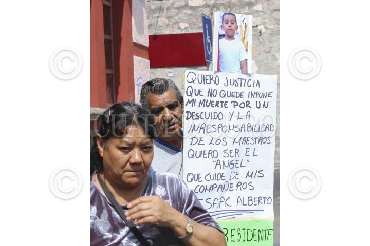 MORELlA, MICHOACÁN, 16JUNIO2014.- Familiares del niño Isaac Alberto Vázquez Morales, quien falleció hace algunos días en un balneario de Huandacareo, se manifestaron con pancartas frente a la escuela primaria Benito Juárez para demandar justicia, al considerar que fue un descuido por parte de autoridades educativas quienes no se responsabilizaron de su estancia en el campamento que se efectuaba en este lugar. La manifestación, encabezada por el abuelo del menor, José Refugio Morales no afecta la circulación sobre la calle Ortega y Montañez. Las consignas rechazan las acciones de la maestra Blanca Estela Villarreal y demandan la atención en el caso. FOTO: JUAN JOSÉ ESTRADA SERAFÍN /CUARTOSCURO.COM