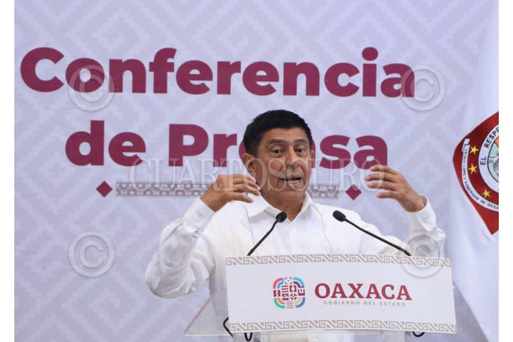 OAXACA DE JUÁREZ, OAXACA, 11 DE AGOSTO DE 2025.- Durante su conferencia semanal matutina, el gobernador de Oaxaca, Salomón Jara Cruz, acompañado por autoridades de Villa Hidalgo Yalálag, artesanos y miembros de la comunidad, anunció acciones de reparación del daño que propondrán a la marca Adidas y al diseñador Willy Chavarría por el calzado “Oaxaca Slip On”, cuya silueta se inspira en los huaraches tejidos que se elaboran desde hace más de 100 años en Yalálag. Señaló también que se trabajará para fortalecer la legislación en materia de protección del patrimonio cultural de los pueblos. FOTO: CAROLINA JIMÉNEZ MARISCAL / CUARTOSCURO.COM