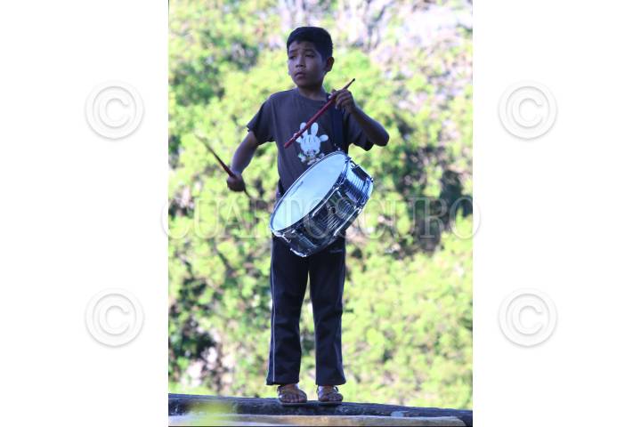 Un niño ensaya con su tambor en la comunidad de Huautla.