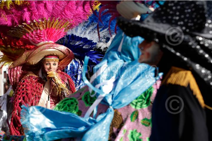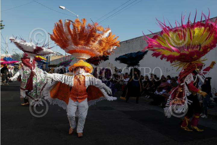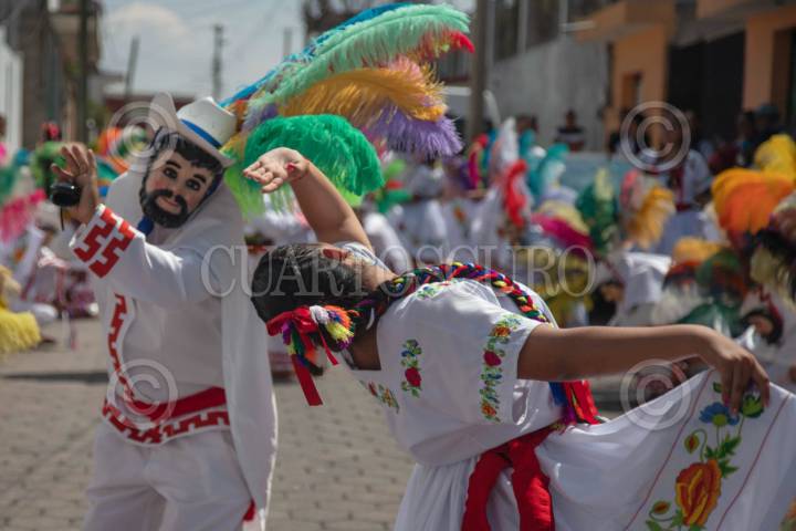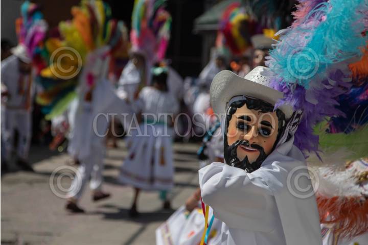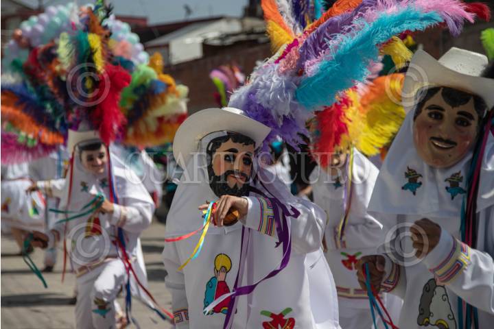 TOTOLAC, TLAXCALA, 18FEBRERO2024.- Portando enormes plumeros de pluma de avestuz y coloridos trajes, se observan a los danzantes de carnaval conocidos localmente como HUEHUES, realizando las evoluciones de sus coreografias durante la celebración del carnaval en esta comnunidad de Totolac. El carnaval posee profundas raíces que mezclan las tradiciones culturales europeas y las indígeneas, tal es el caso de la música que combina sones musicales de los elegantes bailes de salón, con piezas del jarabe tlaxcalteca. Asi mismo, las máscarás son una especie de burla, que los trabajadores indígenas realizaban de los hacendados europeos. FOTO: J.GUADALUPE PÉREZ /CUARTOSCURO.COM