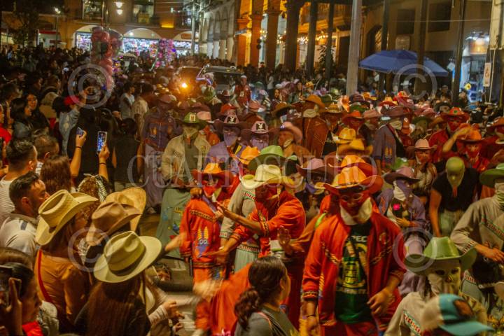 PUEBLA, PUEBLA, 13FEBRERO2024.- Cuadrillas de huehues (término náhuatl que significa viejo) de los 4 barrios del municipio de Huejotzingo participaron en el último día del Carnaval 2024, en medio de un ambiente de fiesta. FOTO: MIREYA NOVO/CUARTOSCURO.COM