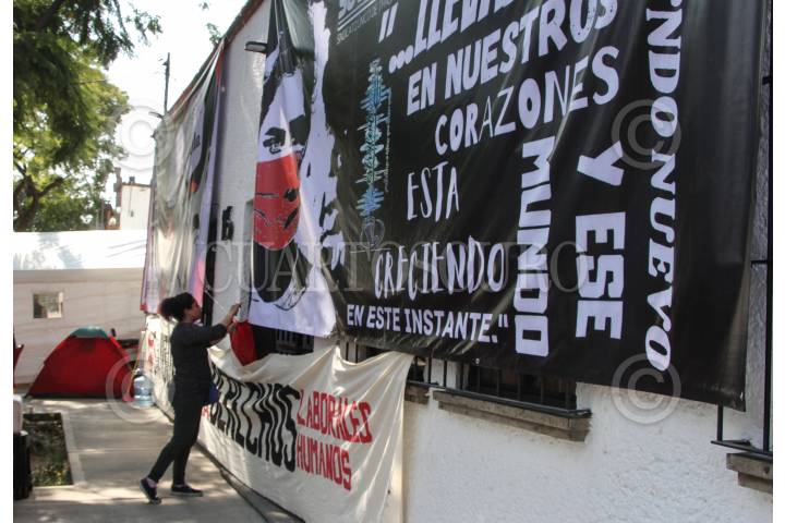La fachada de la sede alterna de la agencia Notimex, se mantiene con lonas alucinas a la huelga en la alcaldía Coyoacán. FOTO: ROGELIO MORALES /CUARTOSCURO.COM