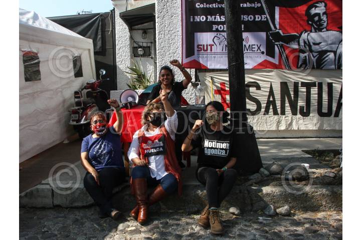 Integrantes de SutNotimex, frente a las lonas de huelga, supuestamente retiradas por el dueño del predio. FOTO: ROGELIO MORALES /CUARTOSCURO.COM