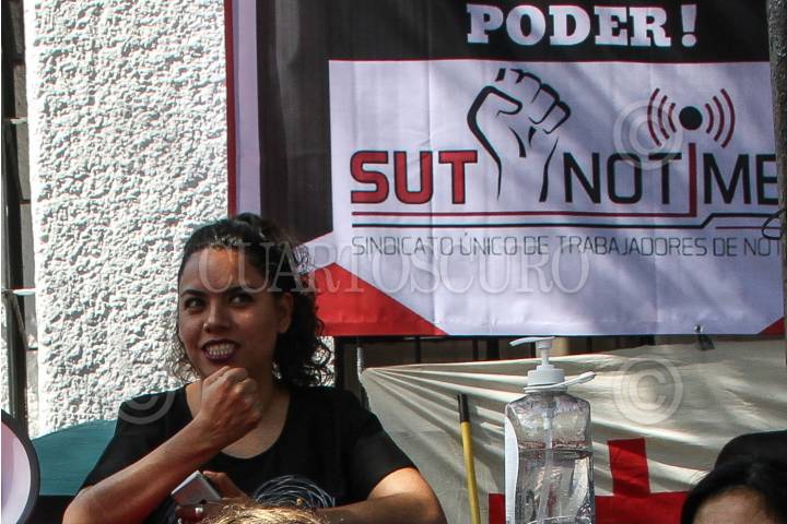 Adriana Urrea e integrantes del SutNotimex a las afueras de la sede alterna de la agencia. FOTO: ROGELIO MORALES /CUARTOSCURO.COM