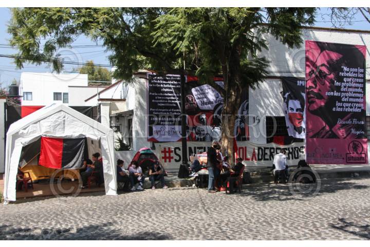 Lonas de la huelga Notimex, supuestamente retiradas por el dueño del predio. FOTO: ROGELIO MORALES /CUARTOSCURO.COM