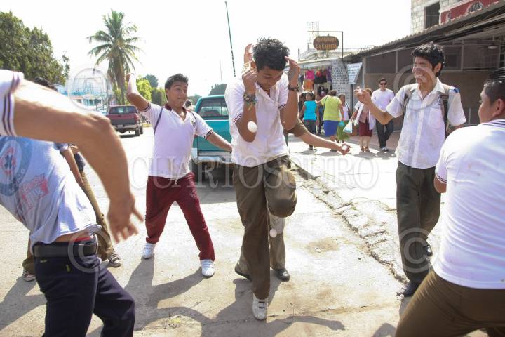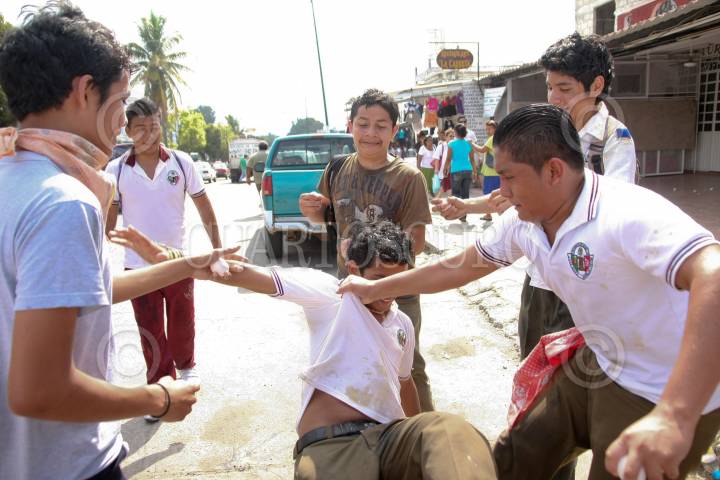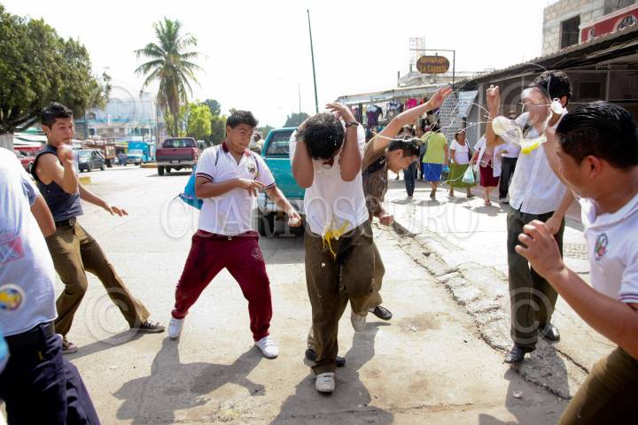 TENOSIQUE, TABASCO, 19ENERO2011.- Escolares del nivel secundaria se arrojan de huevos unos a otros en este inició del carnaval mas raro del mundo. Esta tradición popular hasta el momento ha dejado a un joven estudiante herido de gravedad por machetazo; según reporte de la Policía municipal el educando fue atacado por una banda de delincuentes conocida por "Los Caguamos", quienes esperaron al estudiante a las afueras de la secundaria federal José María Morelos y Pavón para herirlo de gravedad. FOTO: MARCO POLO GUZMÁN HERNÁNDEZ/CUARTOSCURO.COM