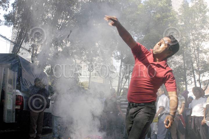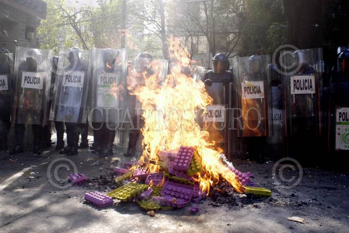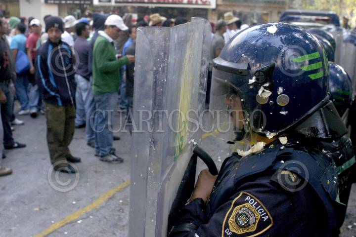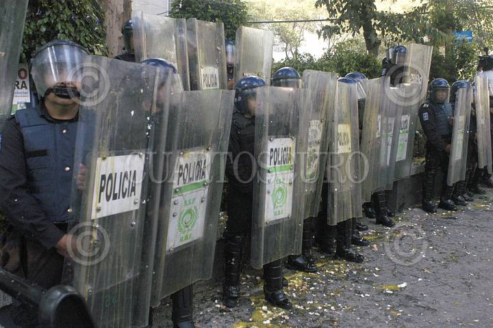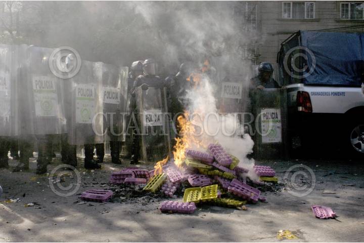 MÉXICO, D.F., 10JUNIO2011.- Maestros pertenecientes al Sindicato Nacional de Trabajadores de la Educación se manifestaron en el edificio que alberga un departamento propiedad de la líder magisterial Elba Esther Gordillo, en la colonia Polanco. Este era custodiado por granaderos de la Secretaría de Seguridad Pública quienes fueron agredidos a huevazos por los docentes. FOTO: LUIS CARBAYO/CUARTOSCURO.COM