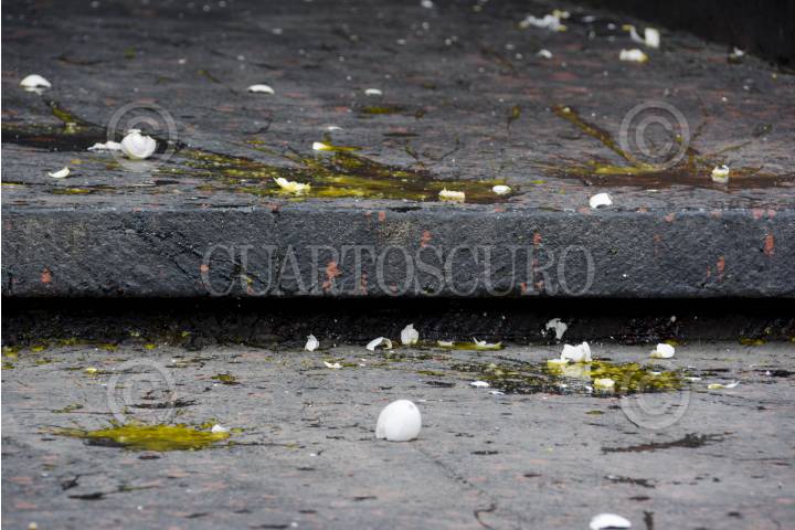 OAXACA, OAXACA, 02NOVIEMBRE2015.- Para demandar la liberación de los profesores, Othón Nazariega, Efraín Picasso, Roberto Abel Jiménez y Juan Carlos Orozco detenidos el pasado jueves y trasladados al penal del Altiplano, un grupo de encapuchados arrojaron huevos y rollos de papel higiénico en contra del palacio de gobierno para recriminar al gobernador, Gabino Cué lo que consideran su rendición ante el gobierno de Enrique Peña Nieto.. FOTO: ARTURO PÉREZ ALFONSO /CUARTOSCURO.COM