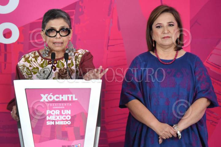 CIUDAD DE MÉXICO, 07MARZO2024.- Rosanety Barrios, especialista en Energía, junto a Xóchitl Gálvez, candidata a la Presidencia de la República por la Coalición Fuerza y Corazón por México, durante la conferencia de prensa "Por un México sin Miedo", en la que se compartió un proyecto para mejorar la calidad del aire en la capital del país. FOTO: MARIO JASSO/CUARTOSCURO.COM