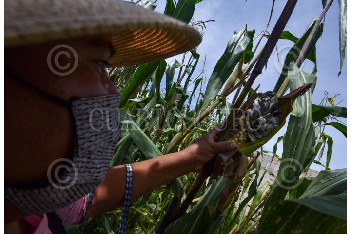Mujeres de la zona indígena de Toluca a temprana hora acuden a los campos de cultivo a cosechar elotes y huitlacoche para preparar sus alimentos con productos frescos.