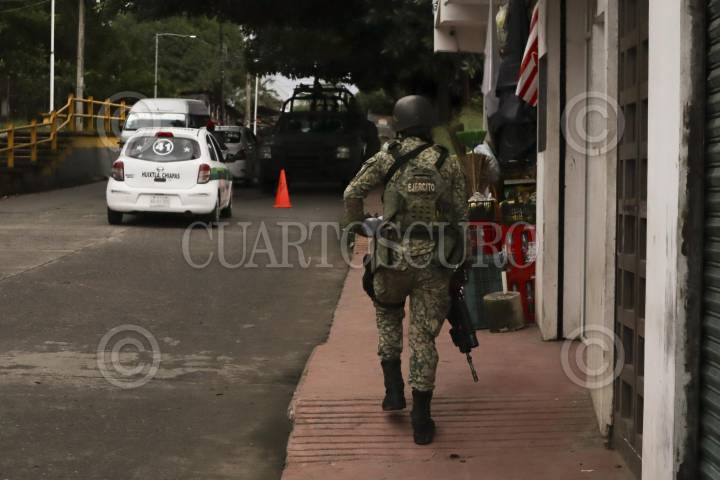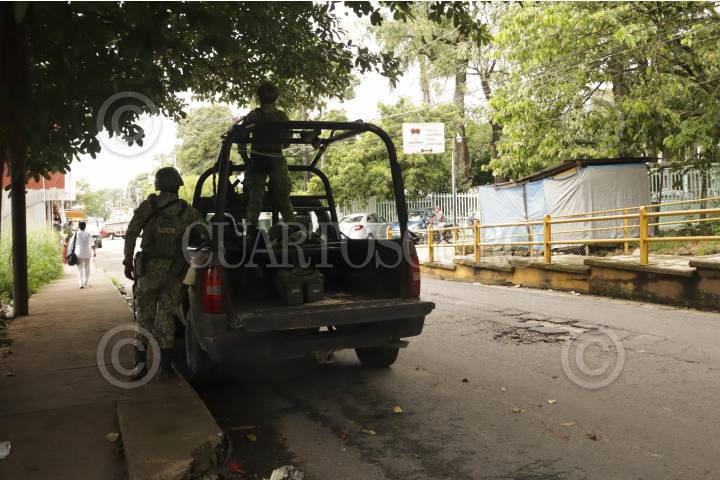HUIXTLA, CHIAPAS, 03OCTUBRE2024.- El Ejército Méxicano custodian el Hospital del IMSS donde se encuentran las personas migrantes, que fueron lesionados este martes en la noche durante un enfrentamiento entre autoridades y coyotes en los Cocos, en el tramo del municipio de Huixtla y Villa Comaltitlán. Las personas migrantes serán trasladados a la estación migratoria Siglo XXI en una ambulancias, custodiados por el Grupo Beta (protección a migrantes). FOTO: DAMIÁN SÁNCHEZ/CUARTOSCURO.COM