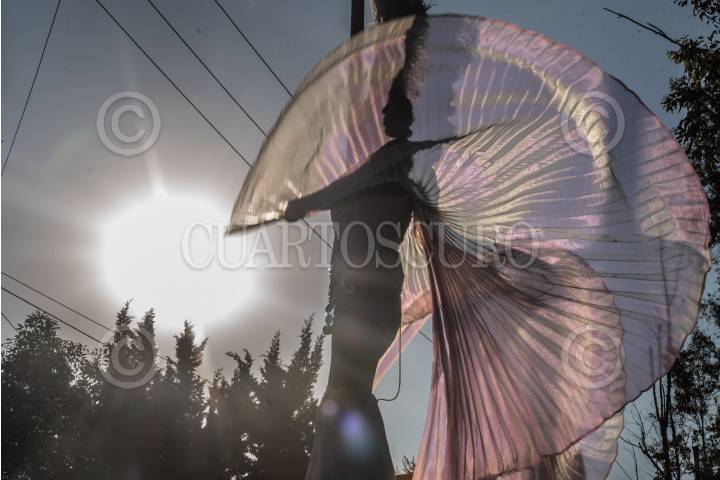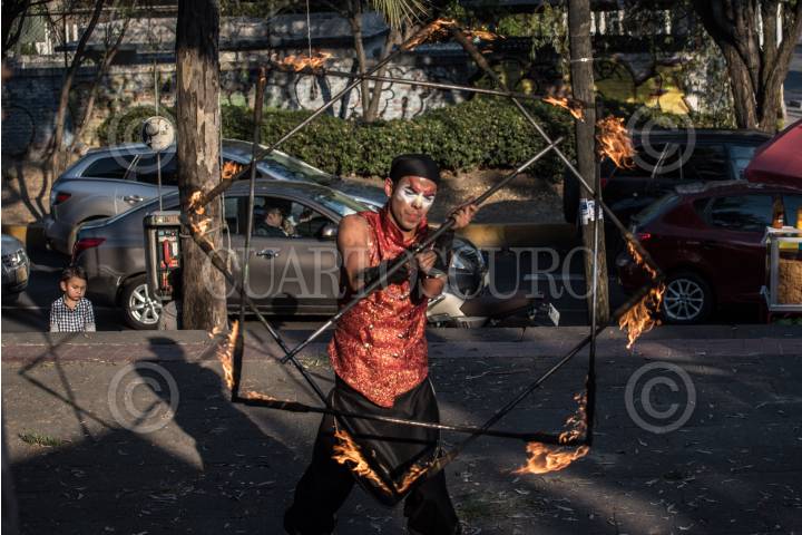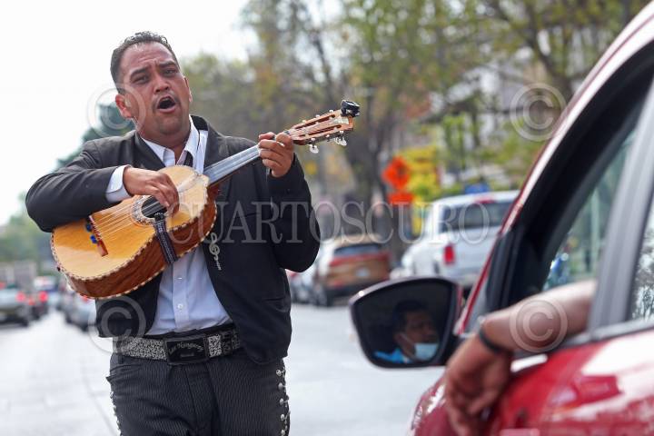 Un hombre que pertenece a una agrupación de Mariachi entona una canción para tratar de recaudar unos pesos para llevara al hogar, esto en un crucero del centro de Guadalajara.