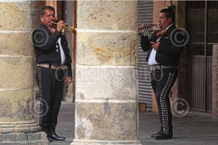 Dos hombres que pertenece a una agrupación de Mariachi practican algunas notas mientras espera clientes para ofrecer sus servicios, esto en la Plaza de los Mariachis de Guadalajara.