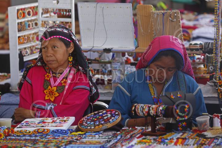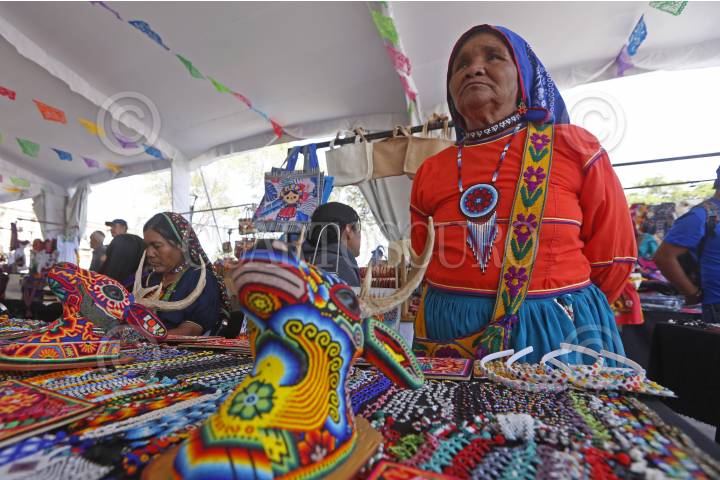 Mujeres de origen indígena comercian sus productos, esto durante el Festival de Lenguas Materna, realizado en la Plaza de las Américas en Zapopan.