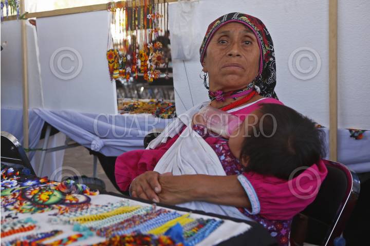 Una mujer de origen indígena alimenta a su pequeño, esto durante el Festival de Lenguas Materna, realizado en la Plaza de las Américas en Zapopan.