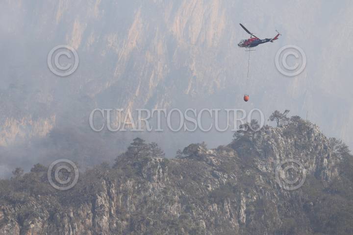Continúan labores para combatir incendio en Sierra de Santiago en la zona conocida como ejido La Ciénaga. Fuertes vientos e intenso calor provocan la intensificación del siniestro y largas cortinas de humo.